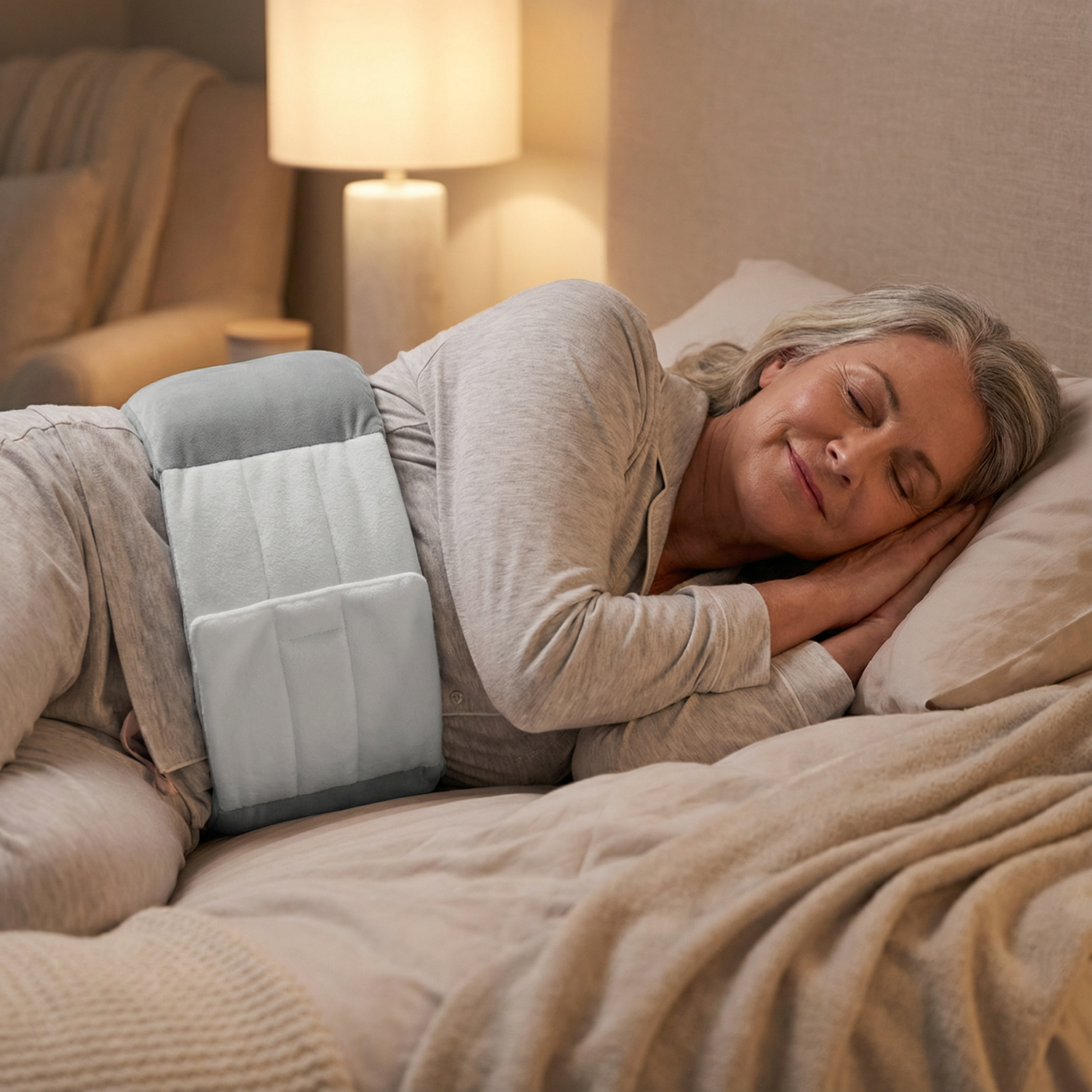 Absolutely. Unlike bulky wedge pillows that restrict your movement, NightAlign's wrap-around design stays in place without locking you down. You can still change positions freely throughout the night — the strap is adjustable & comfortable. Most users adapt within 2-3 nights and say they can't sleep without it once they're used to the support.